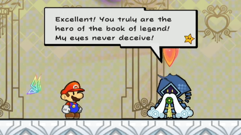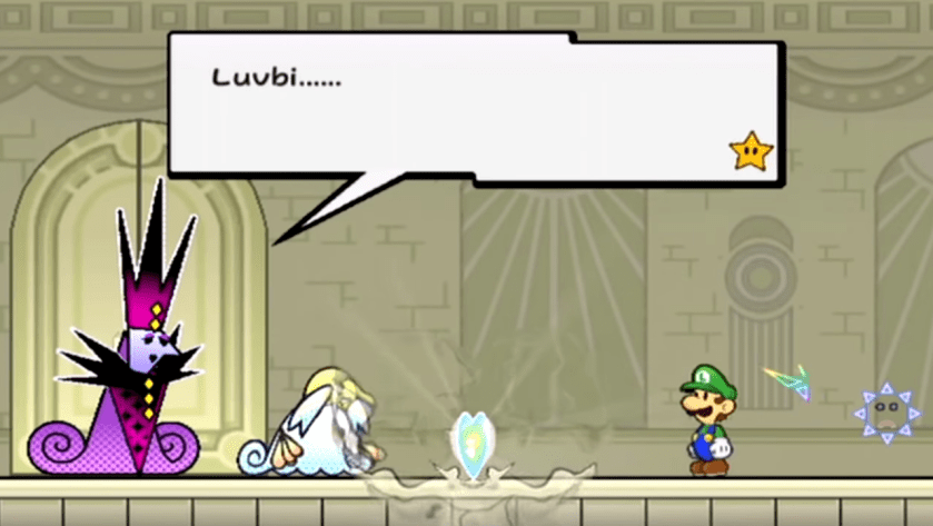 I read another pro-Super Paper Mario article that talks about how, yes, Bleck and Tippi exist at the center of the story, but the game, which presents itself as “a tale of love” from the beginning, is paying just as much attention to the love that exists surrounding Bleck and Tippi [2]. That their sacrifice, an epitome of romantic love, is painful for the other characters to witness (and thus painful for us) because these characters lose people whom they consider true friends. That love of friendship, and all the other kinds in between, may not be as front-and-center as Bleck and Tippi, but is just as nuanced and important considering the rest of the game’s themes.